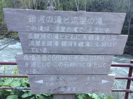 旭川市内から国道39号線で東に65キロ,層雲峡温泉街を過ぎてまもなく,銀河トンネルの直前から右折して少し入ったところが駐車場になっている(ここは国道39号線の旧道).この駐車場そば手前にあるのが流星の滝,奥が銀河の滝である.流星の滝は落差90メートルの直瀑で,一直線に落ちる豪快なさまから雄滝の別名が,銀河の滝は落差104メートルで途中から末広がりのように幾筋にも別れ,白糸のようにも見えるその優美さから雌滝の別名がある.二つの滝を称して夫婦滝とも呼ばれるが,駐車場からは両方の滝を同時に見ることはできない.しかし,駐車場から遊歩道を20分ほどの双瀑台に登ることでこの2つの並んだ滝を眺めることができる.