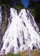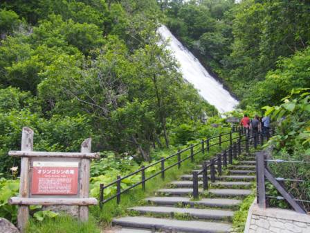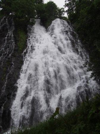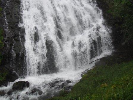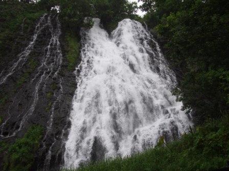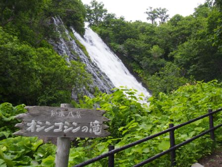 そうした知床半島沿岸部の滝群の中でもっとも有名なのが,表題のオシンコシンの滝である.場所はウトロ市街地から南に7キロ,国道334号線傍にある.知床連山の温音別岳の西に源流を持つチャラッセナイ川に架かる滝で,その落差は50メートルあり,途中から滝の流れが2つに分かれている様から双美の滝の異名を持っている.国道傍に駐車場があり,そこから遊歩道を数分で滝の中央部に到着,目の前で優美な滝の姿を拝むことができる.ちなみにオシンコシンとは,「そこにエゾマツの群生するところ」ということを意味するアイヌ語「オ・シュンク・ウシ」が転じたものと言われている.自分は過去この滝を3回訪問しているのだが,1994年と2018年の際は滝の向かって左側は水量が少なめであった.