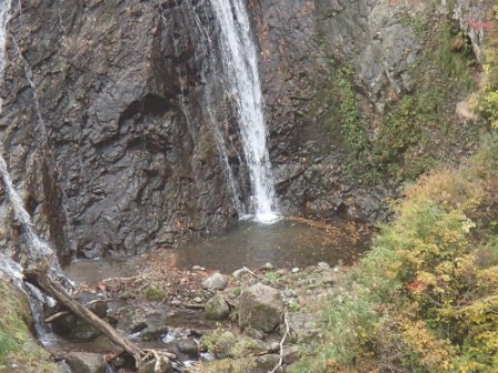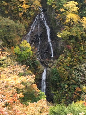 今回のテーマ七ツ滝はそんな六十里越街道の途中,かつて宿場として栄えた田麦俣集落近くにある.月山・湯殿山の南西を走る国道112号線の新道に並行して流れる梵字川の支流,田麦川に架かる滝で,上段は幾筋かに分かれ,下段で一本に合流する.落差は上段50メートル,下段40メートル,合わせて90メートルである.
