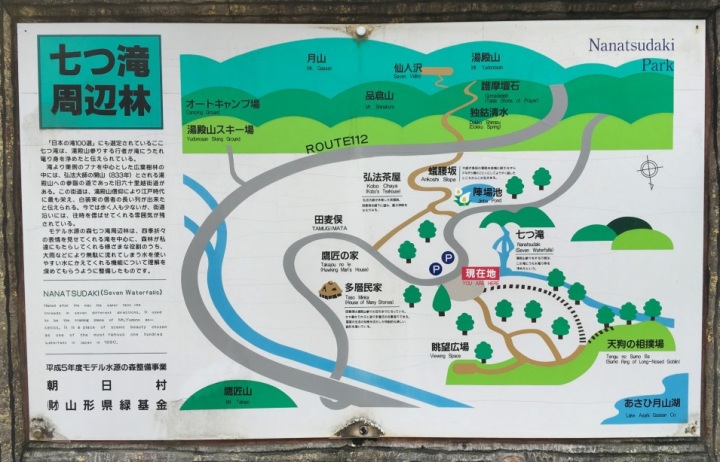 鶴岡市内から国道112号線を南下,梵字川と田麦川が分岐する付近から旧道に入って田麦俣の集落近くの七ツ滝公園から滝を望むことができる.
