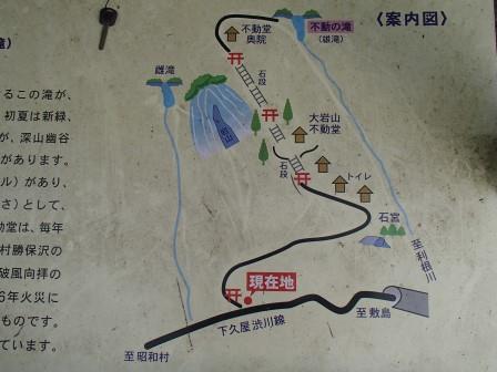 昭和村から渋川市にかけて利根川の左岸を走る県道255号線(途中すれ違いが困難な狭い部分あり)沿いに鳥居と大きな看板の立つ駐車場があり,ここから舗装された遊歩道を歩いて登っていく.5分ほどで棚下不動尊のお堂に到着.ここから雄滝が遠望できる.