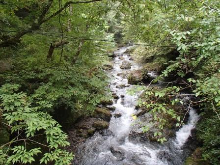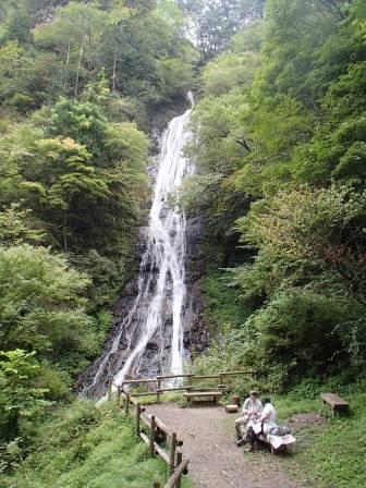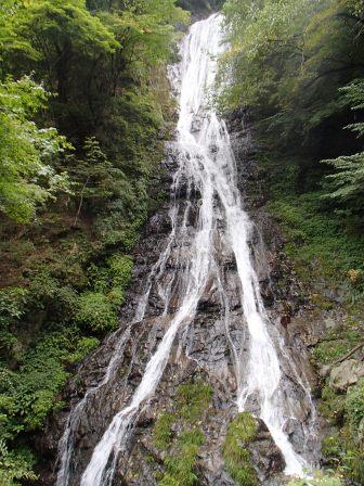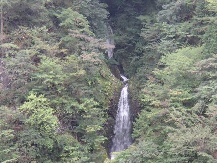 東ルート入り口の橋を渡りキャンプ場の中を通って歩いていく.勾配は徐々に大きくなっていくのだが,思ったほどではなく比較的歩きやすい道だ.結局20分かからずに滝下に到着,ここからは滝の三段目を見上げる構図になる.途中で二股に分かれて落下する50メートルの滝が見事であった. |