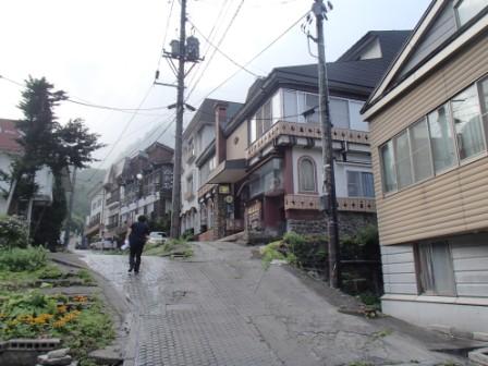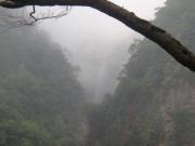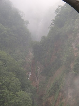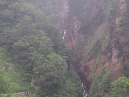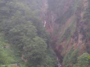 標識には徒歩5分と書かれていたが,実際にはかなりの急坂で息が上がる.途中には燕温泉名物(?)「黄金の湯」と名付けられた露天風呂があった.あえぎながら坂を登ってようやく展望所に到着したが,肝心の滝はガスのためまったく見えない(泣).ただ山の天気は変わり |