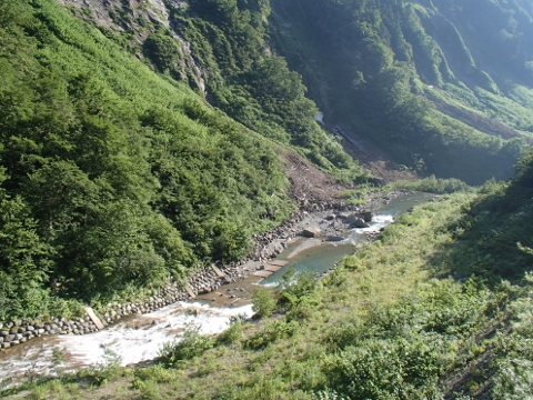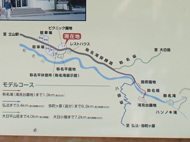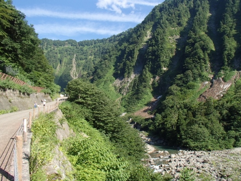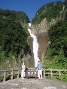 立山駅から県道6号線を東に向かい,途中立山有料道路の分岐点を右手に見ながら県道170号線に入りさらに東進する.しばらく走ると駐車場とレストハウスが出現,ここが一般車が入れる終点である.ここから滝に向かって歩き始めるのだが,道は登山道でも遊歩道でもないアスファルト舗装された普通の道,非常に歩きやすいのだが風情はない(笑).歩くこと30分で滝を正面にする滝見橋に到着,西向きの滝のため天気の良い日の午後に訪れると見事な虹がかかっている様子を見ることができる.季節によっては称名滝に向かって右側にもう一本滝が出現することがある.これをハンノキの滝といい,実はこちらの方が落差が大きいのだ.ただいつでも見られる |
