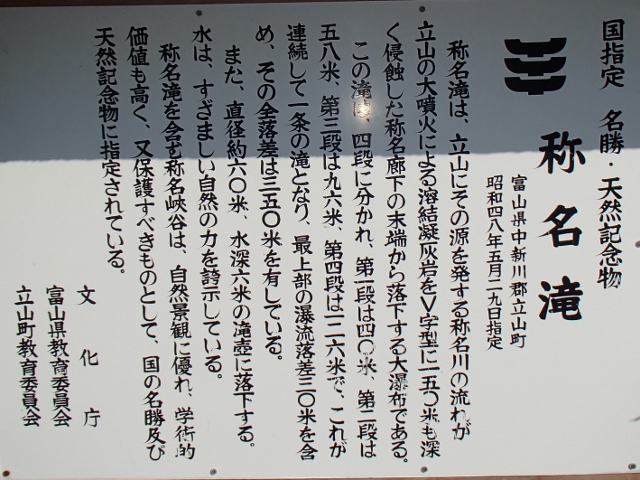 称名滝は全体で4段からなる滝で最上段が70メートル,2段目が58メートル,3段目が96メートル,そして最下段が126メートル,全体では350メートルもの高さを持つ,落差日本一の滝である(落差世界一は南米ベネズエラのエンジェルフォールの約1000メートルなので,その3分の1ということになる).滝壺の直径は60メートル,水深は6メートルとなっており,そのまま称名川を形成して西流し,やがて常願寺川となって日本海に注いでいる.