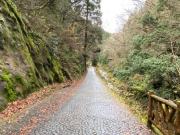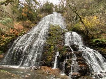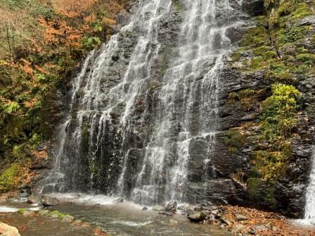 訪問したのは2020年11月下旬,南越前町で越前ガニを食した翌日である.沿岸部から車で内陸に向かい,越前市を通って池田町の中心部へ.そこから国道476号線を北上し,松ケ谷三差路から県道34号線に右折する.当初は普通の2車線道路だが,やがて幅員3メートルの林道となる.対向車が来ないか恐る恐る走ること10分弱で龍双の滝第1駐車場に到着である.この日は自分以外誰もおらず貸し切り状態だった.駐車場からはさらに道なり(この辺から道がさらに狭くなりしかも石畳っぽい感じで一瞬歩道では?と見間違えるほど)に歩くこと数分で滝が目の前に広がった.尚,滝を挟んで第1駐車場と反対側に第2駐車場がある(万一第1駐車場が混んでいたらそちらへ).