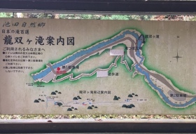 福井県のほぼ中央に位置する池田町は町域の90%が山地という非常に山深い自治体である.今回のテーマである龍双ヶ滝はそんな池田町中心部からさらに北西の山中にある.福井県最大の河川である九頭竜川水系の足羽川の支流部子川に架かる滝だ.落差は60メートル,滝幅は20メートルで岩肌を滑るように広がって落ちていく,いわゆる分岐瀑である.