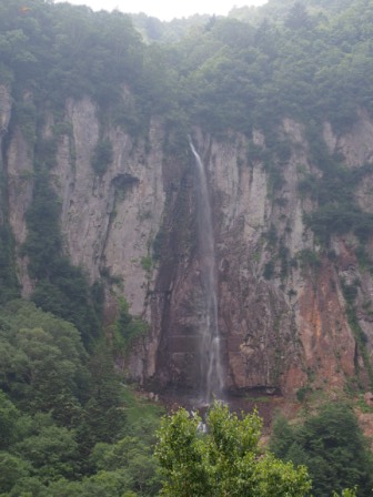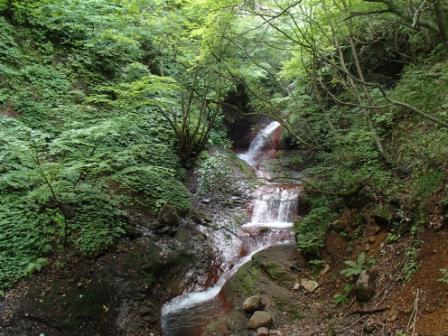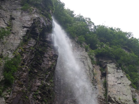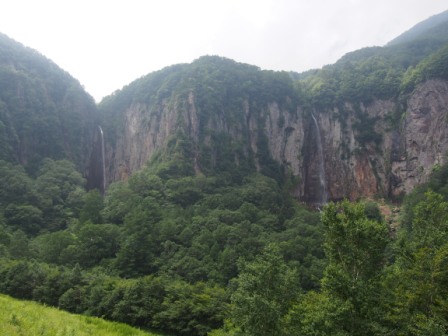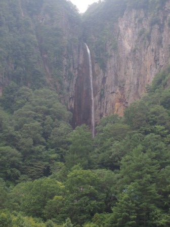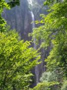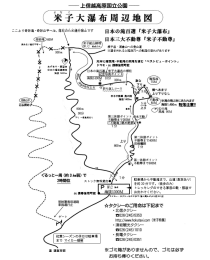 米子大瀑布の2つの滝は群馬県との県境にある四阿山を源流として,山の北側の断崖からすべり落ちる直瀑である.西の不動滝は落差85メートル,優しく霧のように落ちる女性的な滝であるのに対して,東の権現滝は落差75メートル,水量があって豪快な男性的な滝である.断崖に沿ってこの2つの滝が並ぶさまから夫婦滝とも呼ばれている.崖下に落ちた二つの水流はやがて合流して米子川となって西流し最終的に千曲川に至る(日本一長いとされ,長野県以外の46都道府県では信濃川で知られる川も,長野県内を流れている間は千曲川と呼ばれる).