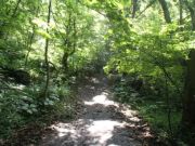 駐車場からは遊歩道以上登山道未満の道をひたすら歩く.ほどなく二又の分岐点があった.チラシによると右側に向かうのが順路らしくそちらに進む.8月初めの一番暑い時期だったが森の中で直射日光が当たらないためか,暑さは感じない.ただ道は徐々に登りになり日頃運動不足でなまった体には堪えてくるのだった.