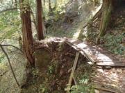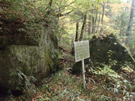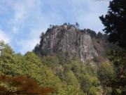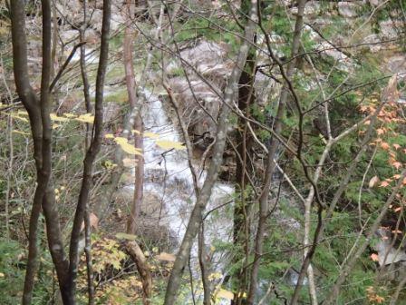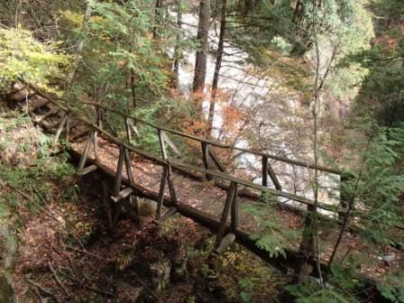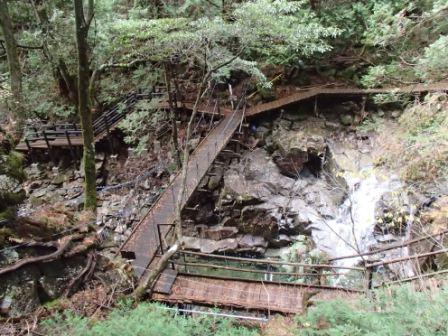 前述のようにこの遊歩道は上流に向かっていくため,ひたすら登りとなる.道は基本的には整備されているとはいえ,断崖に木道(しかも木が一部腐りかかっている)を渡しただけのところや,強度の不安から一人ずつしか渡れない吊り橋などがあってスリル満点である(笑).しかもスタートからしばらくは大滝川を離れたコースを進むため,なかなか滝が現れずもどかしいのだった.もっとも途中に不動岩が遠望できるスポットや昔猟師が猪を追い込んだというしし岩などの見どころはあった.