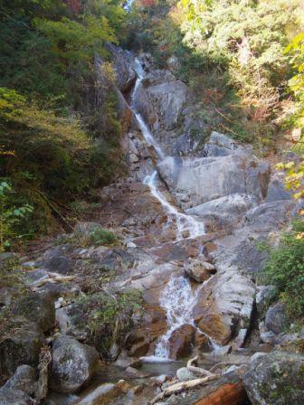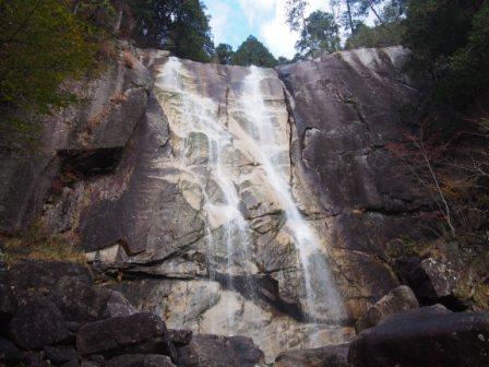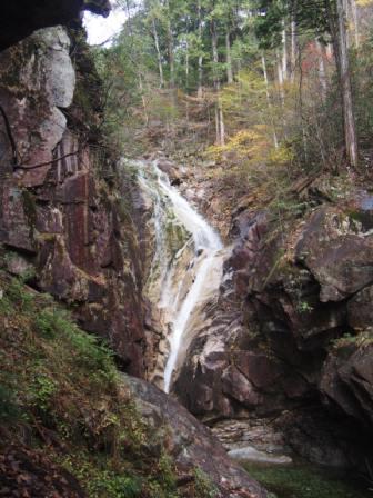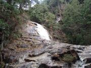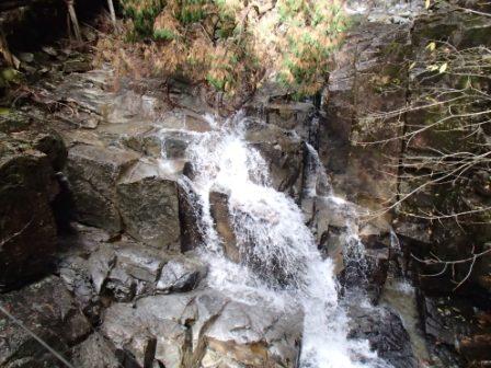それでもスタートから約50分で,ようやく最初の滝「螺旋滝」への分岐点に到着,ここから脇道に入って急な坂を降りていくと滝が出現した.滝口から落ちた水が途中の岩にあたって方向を変える様が,たしかにらせん状に落ちているように見える滝だった.
