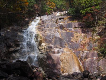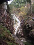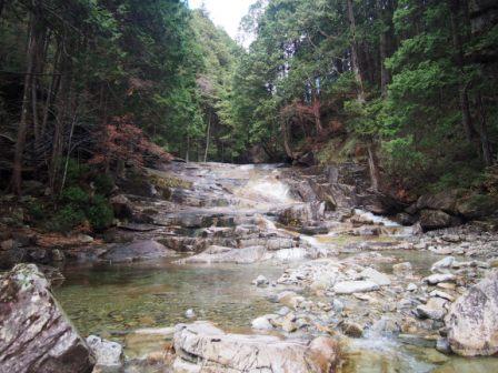 来た道を引き返し本道に戻って数分で「洗心滝」である.ただこの滝,木々の間からチラッと見えるだけだった(パンフレットには立派な写真が載っているものの,展望所がある様子もない).ちょっと拍子抜けしたもののさらに先に進む.しばらく行くと花崗岩の断崖を踊るように落ちている「霧ヶ滝」,さらには田立の滝の中でも主瀑ともいうべき「天河滝」と大型の滝が連続して登場,一気に気分が盛り上がる(ここまででスタートから1時間半ほど).特に天河滝は落差40メートルを一気に落ちる直瀑で,かつてこの地の人々がこの滝を神聖視し,雨乞いの神事以外には近づかなかったという話がうなずける豪快さだった.