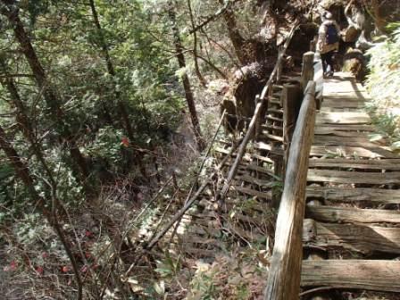 この天河滝を過ぎたあたりから遊歩道は一段と険しくなる.急な道を登って天河滝の滝口に出る(ここから滝口に入る人が多いらしく,「進入禁止」の看板が出ていた).ここで天河橋という名の橋を渡って大滝川の左岸へ.しばらく行くと頭上に見えてくるのが「不動滝」,これは不動岩の直下にある滝という意味らしい.この不動滝の見える地点から古い木道がつづら折れになって一気に高度を上げていく場所があり,ちどり桟橋と呼ばれている.一応手すりが付いているが,結構古くて崩れたら大変だなと思いながら登っていった. |