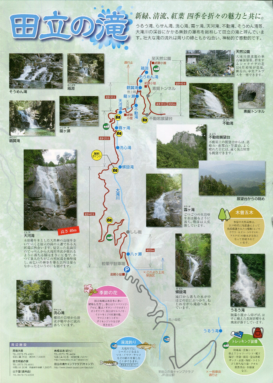 | 長野県南部(いわゆる南信地方)の南木曽町にある100選滝が田立の滝である.とはいえそういう名前の単独の滝があるわけではない.田立の滝とは木曽川の支流,大滝川にかかる滝群の総称である. |