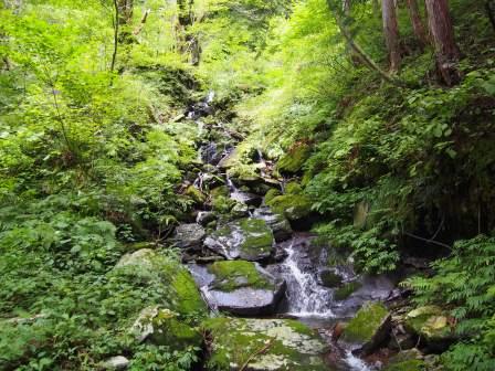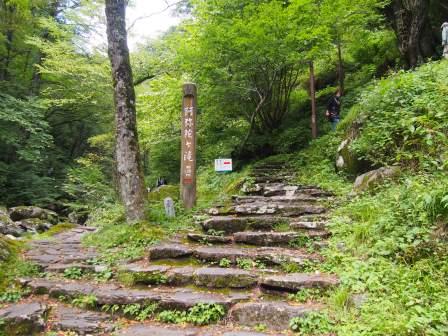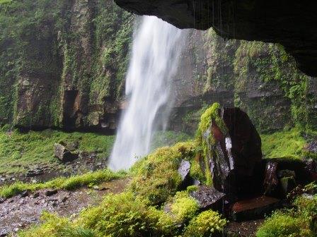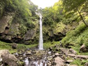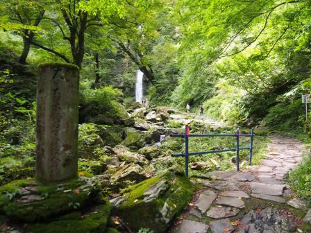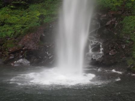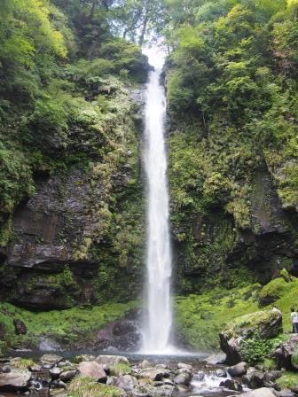 よく整備された遊歩道を歩くこと10分程度で滝に到着,落差の大きさに感動,滝壺から滝の裏側に入り裏見ができるのも魅力である.この日は観瀑後,遊歩道入り口の食堂で流しそうめんをいただいた.