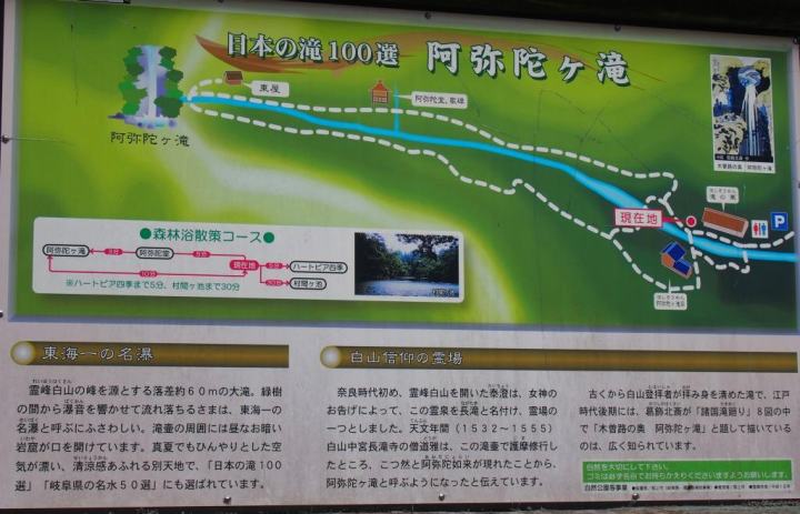 海なし県として知られる岐阜県,その南部美濃地方こそは,愛知県尾張地方にかけて一大穀倉地帯である濃尾平野が広がるが,北部は山が多く平地に乏しい地形である.こうした山岳地帯には数多くの川の源流があり,その多くは木曽川水系など太平洋に注いでいるが,神通川,九頭竜川など日本海に至るものも一部ある.河川が多い山地とくれば滝の多い地形ということであり,今回のテーマである阿弥陀ヶ滝も岐阜県中部郡上市の北部,白鳥町に位置する滝である.