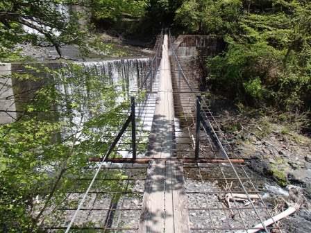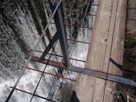 この吊り橋,手すりがあることはあるのだが,その位置が低く,しかも足元は鉄網に古ぼけた板を渡しただけという造りだ.足元を見るとはるか下に川が流