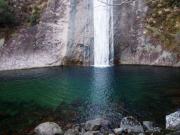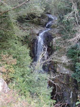 三重県熊野市と和歌山県新宮市の県境となっている熊野川の左岸を走っている国道168号線,これを18キロほど内陸に入ったところに旧熊野川町の中心部がある(現在は新宮市役所の熊野川行政局).ここから県道780号線に折れて,三和大橋という長い橋によって熊野川を渡る.以後は楊枝川沿いに進んでいく(あちこちに案内板があるので迷う心配はない).約10キロほど北東に入るとまず松山滝,続いて荒滝と2つの前座滝が見える.そこから200メートルほど行ったところが布引の滝の展望台である(ただここには駐車スペースがないので,そこからさらに200メートルほど行った先のスペースに車を置くとよい). |