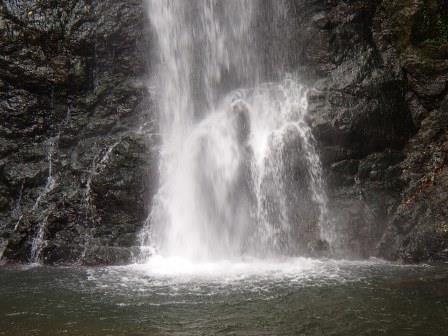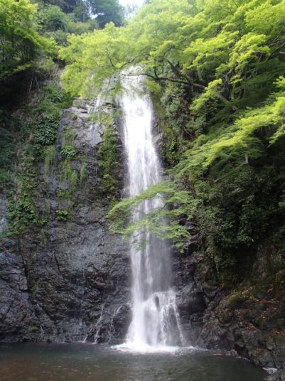 箕面滝は大阪府にある唯一の100選に選ばれた滝である.場所は大阪府の北部の箕面市,摂北山系の石堂ヶ岡を源流とする淀川水系の箕面川にかかっており,幅5メートル,高さ33メートルの規模を誇っている.滝の上流には箕面川ダムがあって水量調整を行っているので,極端な豪雨にでもならない限り滝の水量は比較的一定である(2014年8月にこの地域を襲った集中豪雨では箕面川の水量が著増し,一時滝訪問が不可能になったとのこと).箕面滝という名称は,滝が木々の間を落ちる姿が農具の箕に似ているからといわれている.