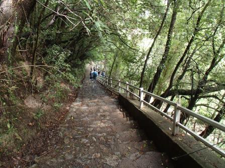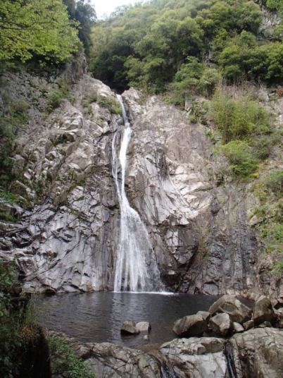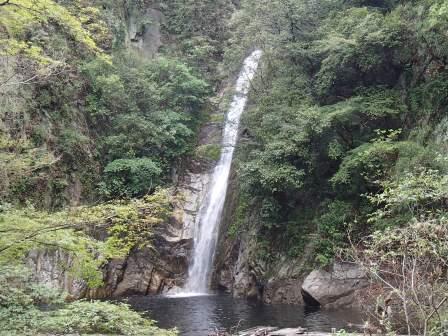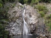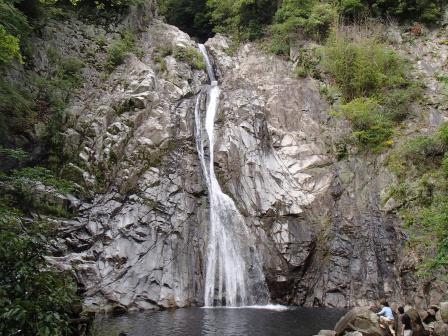 そこから再び遊歩道を登っていくと10分ほどで最終ポイントの雄滝が見えるスポットに到着である.この雄滝は高さ43メートル,先ほどの雌滝に比べて |