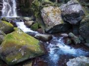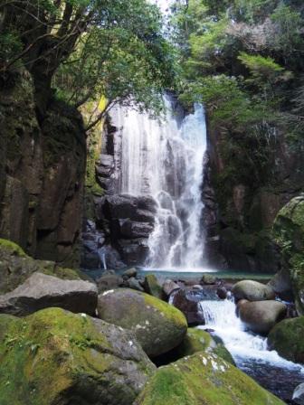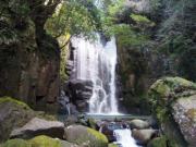 遊歩道はほぼ一本道でところどころに目立つ案内板が出ているので迷うことはないと思われる.途中「一人ずつ渡ってください」と書かれた橋を渡って川の右岸になりそのまま歩いて行った終点が目指す桑ノ木の滝である(最初の橋から15分ほど).高さ21メートル,幅8メートルと比較的小振りではあるが, |