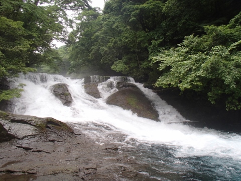 そんな菊池渓谷では川が織りなす様々な地形がみられるのだが,そのひとつが四十三万滝である.なにか特殊な読み方をするのかと思ってしまうが,実はそのまま「よんじゅうさんまんたき」と読むのが正解だ(一説によると昭和9年に九州日日新聞が景勝地の人気投票を行ったところ,四十三万票入ったからという).落差は10メートル程度とたいしたことはないが,周辺の渓谷美と川の複雑な地形が織りなす景色は100選にふさわしい素晴らしいものである.