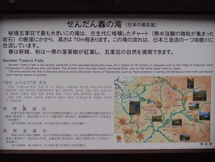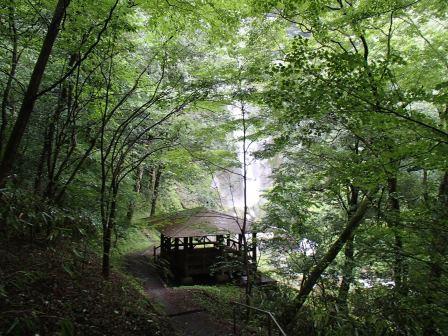 前述のようにこの滝は非常に山深いところにあるため訪問はなかなか大変である.出発地としては八代または人吉となるわけだが,どちらから向かうにしても途中県道52号線の狭くて急カーブの続く道を走らなければならない.本当にこの道で大丈夫なのかと不安になるのだが,途中で民宿や旅館の姿を見て少し安心する.しばらく走ると案内板があり,やがて滝の駐車場が見えてきた.駐車場は意外に広く,土産物屋やトイレも完備している. |
