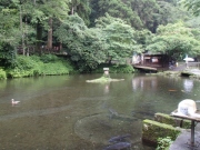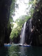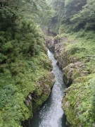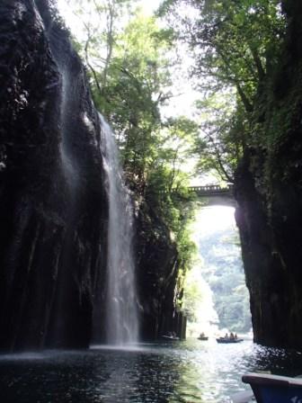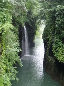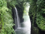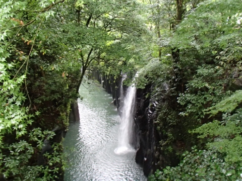 一般に滝は川の途中の段差に形成されるものが多いのだが,この真名井の滝の水源は断崖の上にある”おのころ池”と呼ばれる小さな池で,この池の水が五ヶ瀬川に落下して形成されているものである(伝説によれば,天孫降臨の際に,この地に水がなかったため,天村雲命(あめのむらくものみこと)が水種を移した「天真名井」の水が滝となって流れ落ちているとされる).