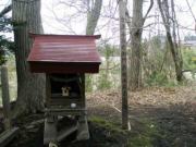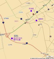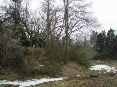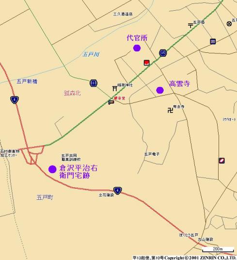 | 国道4号線から立体交差で五戸町内に向かって(上の地図左端からの緑の道路)少し行くと,右に入る狭い道がある.道なりに進み,道が分岐しているところを右に進んでいくと,小高いところがありここに目指す住居跡があった.倉沢平治右衛門は新選組副長助勤斎藤一の妻時尾の義父にあたり,斗南時代彼も(藤田五郎と名を変えていたが)ここに同居していたという.会津のみならず新選組愛好家にとってもはずせないポイントである.今は小さな祠と記念碑が建つだけの寂しい場所であった. |
