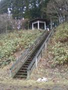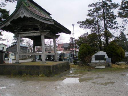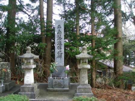 | 円通寺は恐山の本坊といわれるだけあって,現役の寺であり,正面から見てもその威容に圧倒される.境内に入り,向かって左手にあるコンクリートの近代的な建物の前に招魂之碑が建てられてた.これは戊辰三十三回忌(明治33年)にこの地に建立されたもので,戊辰戦争で亡くなった多くの会津藩士の霊を慰めることが目的である.表面の「招魂之碑」は元藩主容大の書である(徳川家は源氏を名乗っていたため,源容大と記されている). |