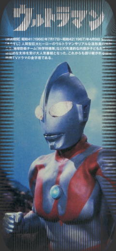 | ウルトラマンは昭和41年7月17日から昭和42年4月9日にかけて,全39話放送されたウルトラシリーズ第2弾である.本作品からオールカラーで製作される一方で,宇宙からやってきた正義の巨大ヒーローと地球を守る正義にチーム(科学特捜隊)というのちに続く基本コンセプトが出来上がった作品である.ウルトラマンは地球上では科特隊のハヤタ隊員と一体化しており,危機が迫るとベータカプセルを光らせてウルトラマンに変身する.数多くの怪獣を倒して地球の危機を救ったが,最終回ゼットンとの決戦に敗れて倒れてしまった. |