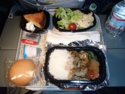 しばらくすると夕食のサービスが始まる.たいていはまず飲み物がやってきて,次に食事というパターンなのだが,この日はいきなり食事だった(短いフライトだからか? 笑).メインはポークライスとシーフードパスタの選択,私はポーク,Kはパスタを選択していた.夕食を摂ってくつろいでいたのだが,近くにいる中国語を話すカップルがずっといちゃついているのが気になった.