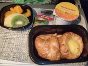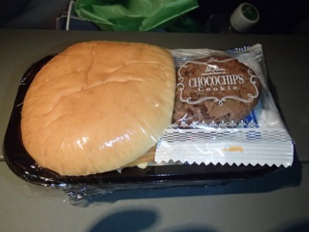 目の前に置かれているパンが朝食なのかと思っていたら,そのうちに本当の朝食がやってきた(実際の朝食もパンだった).食事と言えばお酒がセットになるのが自分のパターンだが,さすがにまもなく着陸なのでこの時はやめた.朝食後飛行機は徐々に高度を下げ,現地時間の9時30分にロサンゼルス空港に着陸である.