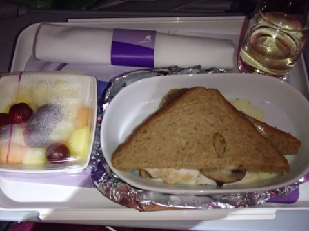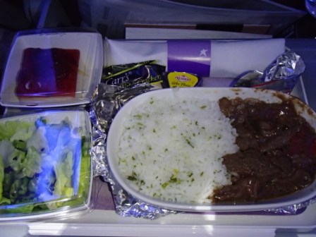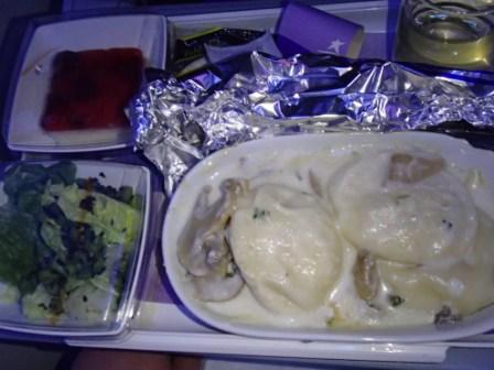 そんなこんなで現地時間16時40分にようやく搭乗開始,その後飛行機は無事に離陸した.夕日がきれいだななどと感心していたら夕食のサービスが始まる.今度はビーフライスとパスタの選択である(ビーフを選択,飲み物はもちろんワイン!).