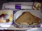 短いフライトとはいえ(しつこいな 笑),現地到着は朝である(2月6日の).向こうの時間に慣れるためにも気合を入れて寝ておかねばということで,眠剤を服用して熟睡する体制を整える.あんまり眠った自覚はなかったが,気が付いたら目の前のモニター画面では日付変更線を越えていたり,いつの間にやらパンが置かれていたりしたのでそれなりに眠った様子だった.