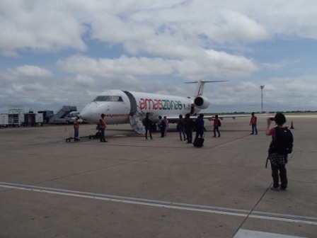 今回利用するのはアマゾナス航空という地元のローカル航空,機材はさすがにプロペラ機ではなかったが,50人乗りのCRJ200だった(当初は18人乗りかもしれないといわれていた).こういう小型機の場合,預け荷物の重量制限が厳しいので大丈夫かちょっと不安だったが,添乗員さん曰く,「万一オーバーだと言われたら,ワイロ的なものでどうにかしようかと思ってたんですが大丈夫でした」とのことだった(ワイロ的なものが通用するお国柄ということらしい.JALやANAなら絶対無理だろうな 笑).
