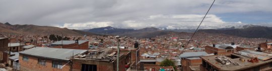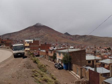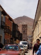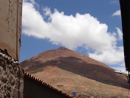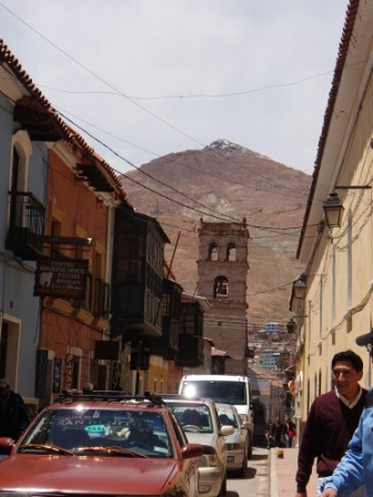 ポトシはかつて銀山で栄えた標高4100メートルにある都市だ.人口は約16万人で,都市としては世界で最も標高の高いところにあるらしい(集落レベルならもっと高いところはある).まずは市内が見渡せる小高い丘に停車,ここはポトシの入り口となっていて,それを象徴する門が立っていた.アンデス地方の他の都市もそうだが,ここポトシも赤茶けた山々に囲まれた茶色い建物が立ち並ぶ街である.ただ,クスコやスクレのような洗練された都市に比べると他の色が混ざっている感じが強く,そのことがこの街の雑然さを強めているような気がした.