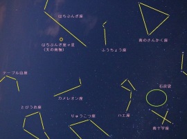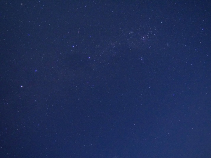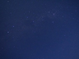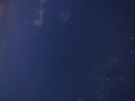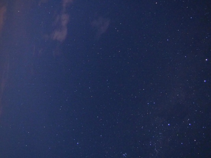 ホテルの外に出た瞬間空を見上げると,星が輝いている.「おおっ〜」,「キャー」と歓声が上げる一同だった.一方でこの日の月齢は21,ちょうど下弦の月の前日あたりということで,右側が欠けた月が高いところに上っている.この月明かりがどれだけ星の観察に影響するのかがポイントである. |