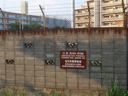 在日米陸軍地域 許可なき者立入禁止 違反者は日本国法律により罰せられます.